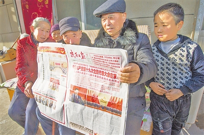 榆阳区青山路街道办事处榆龙社区的居民们在报纸上阅读十九大相关新闻。